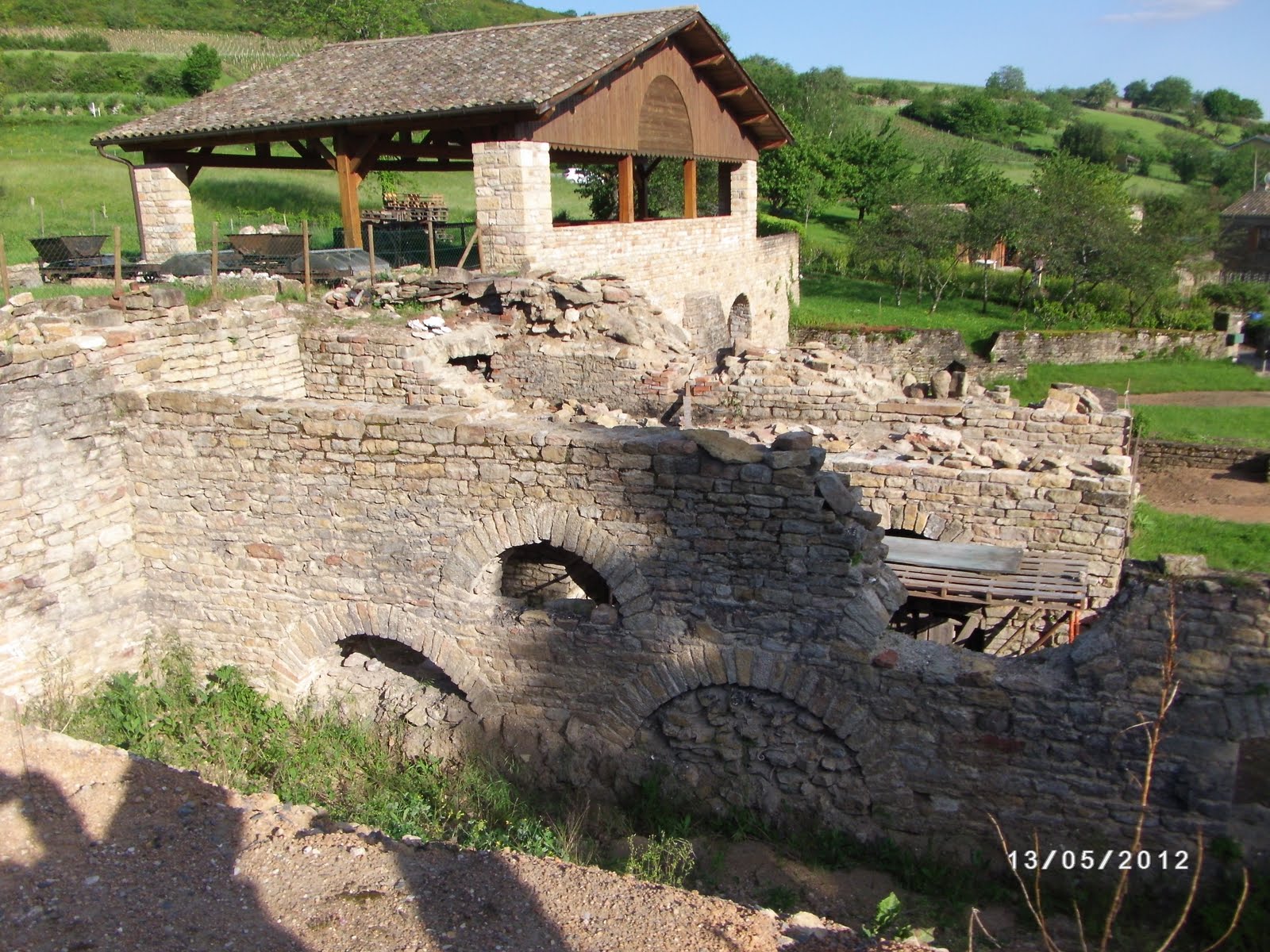 The stone walls in the foreground are what is left of the ovens that were not burning constantly. These ovens would be lit once or twice a week.